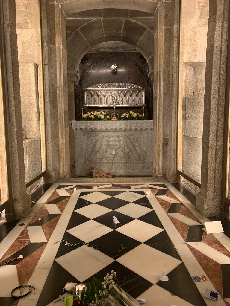 After four and a half weeks on foot, I arrived at the reliquary crypt that housed the bones of Saint James.